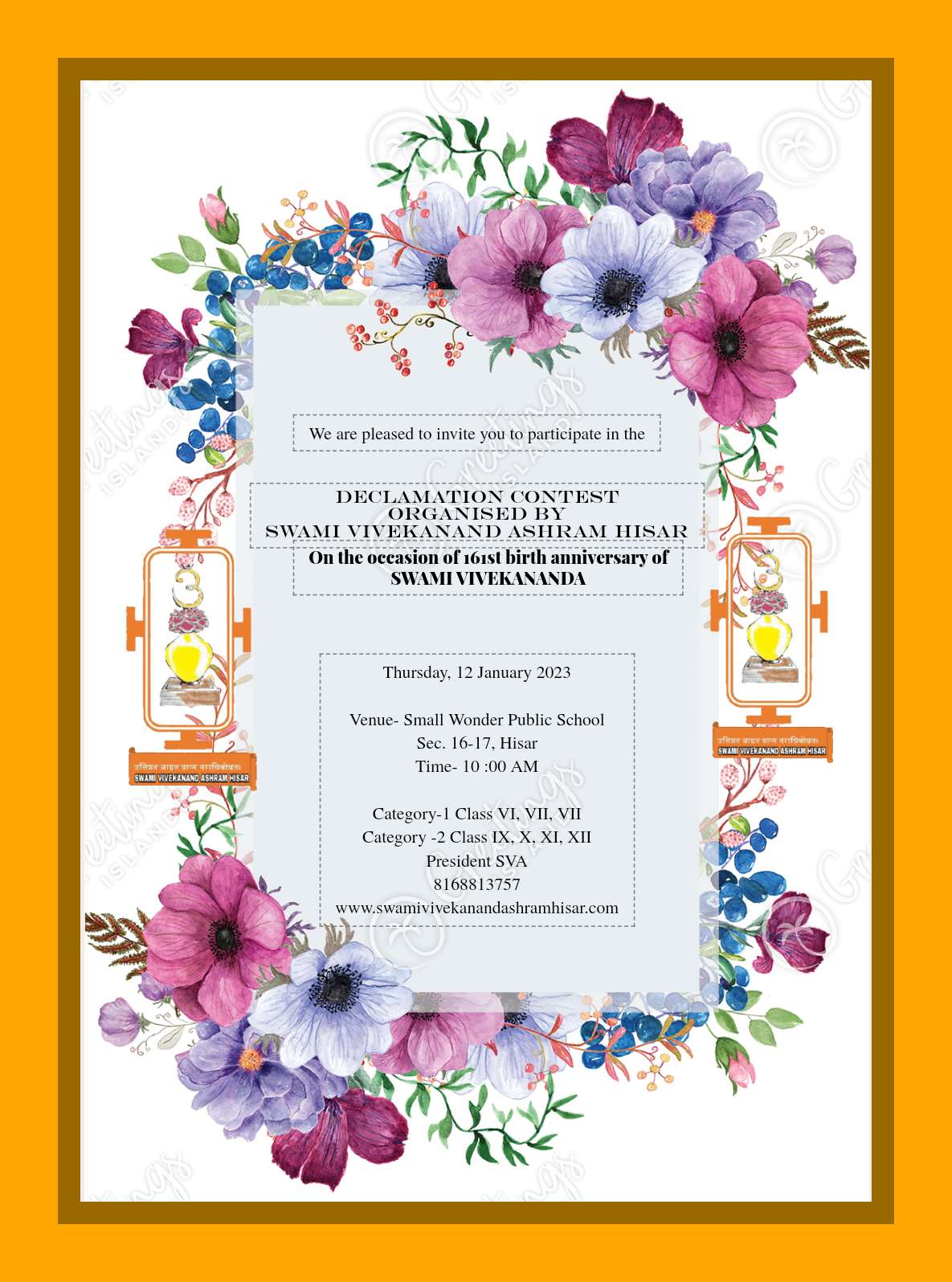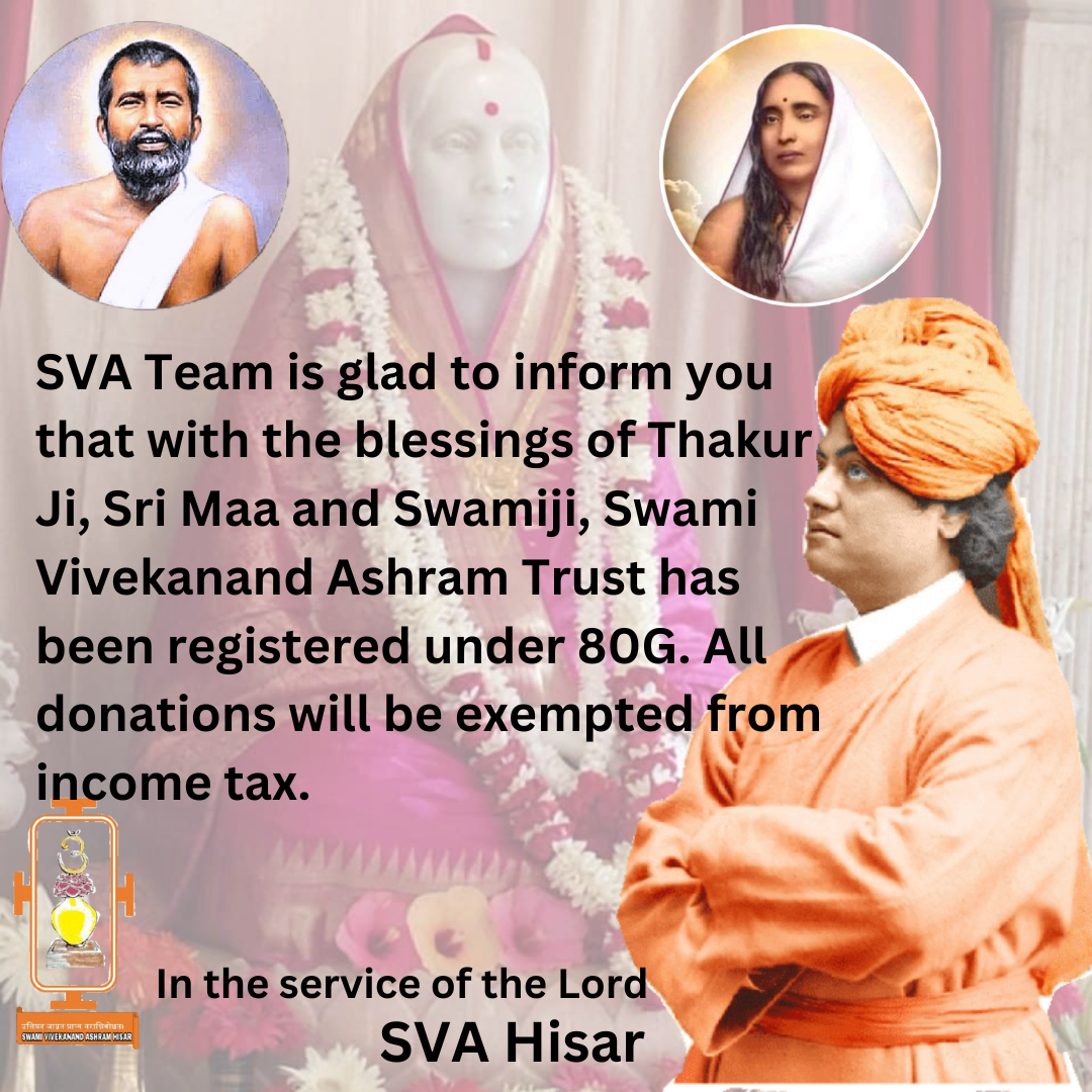 SWAMI VIVEKANAND JAYANTI CELEBRATION (NATIONAL YOUTH DAY) SWAMI VIVEKANAND ASHRAM HISAR Respected Principal Greetings from Swami Vivekanand Ashram Hisar We are immensely pleased to invite you to an INTERSCHOOL DECLAMATION CONTEST which will be organised by SVA HISAR on the occasion of 161st Birth Anniversary of Swami Vivekananda and National Youth Day. This contest will serve as opportunity for the students to get acquainted with the life and teachings of the great saint, philosophers and patriot Swami Vivekananda. It will also help them groom as conscious and responsible citizens of the nation. Details for the same are as follows- Venue: Auditorium - Small Wonder Public School Hisar LANGUAGE : HINDI & ENGLISH DATE : 12 JANUARY 2023 TIME: 10:00 AM TOTAL CATEGORIES: 4 CATEGORY 1. JUNIOR HINDI : Class 6-8 (Duration 2-3 minutes) CATEGORY 2. JUNIOR ENGLISH : Class 6-8 (Duration 2-3 minutes) CATEGORY 3. SENIOR HINDI : Class 9-12 ( Duration 3-4 minutes) CATEGORY 4. SENIOR ENGLISH : Class 9-12 (Duration 3-4 minutes) Topics for Junior Category are given below:- 1. RAMAKRISHNA MISSION’s service to humanity 2. Saint of Dakshineshwar Sri Ramakrishna Paramhamsa 3. Holy Mother- Sri Sarada Devi and Her Teachings 4. Ideal Education in the views of Swami Vivekananda 5. Message of Swami Vivekananda to the Youth of India 6. Karma Yoga by Swami Vivekananda 7. Gyana Yoga by Swami Vivekananda 8. Bhakti Yoga a by Swami Vivekananda हिंदी श्रेणी के लिए विषय इस प्रकार से हैं- 1. रामकृष्ण मिशन की मानवता की सेवा 2. दक्षिणेश्वर के संत श्री रामकृष्ण परमहंस 3. पवित्र माँ- श्री शारदा देवी और उनकी शिक्षाएँ 4. स्वामी विवेकानंद के विचार में आदर्श शिक्षा 5. भारत के युवाओं को स्वामी विवेकानंद का संदेश 6. स्वामी विवेकानंद जी द्वारा बताया गया कर्म योग 7. स्वामी विवेकानंद जी द्वारा बताया गया भक्ति योग 8. स्वामी विवेकानंद जी द्वारा बताया गया - ज्ञान योग Topics for Senior Category are given below:- 1. Relevance of Swami Vivekananda Literature for the younger generation of India 2. Swami Vivekananda’s ideas for the upliftment of women 3. Role of Spirituality in the regeneration of our Motherland as envisaged by Swami Vivekananda 4. You are the creator of your own destiny 5. Contribution of SWAMI VIVEKANAND in Indian Renaissance 6. Lecture by Dr. S. Radhakrishnan on Swami Vivekananda’s Centenary 1963 हिंदी श्रेणी के लिए विषय इस प्रकार से हैं- 1. भारत की युवा पीढ़ी के लिए स्वामी विवेकानंद साहित्य की प्रासंगिकता 2. महिलाओं के उत्थान के लिए स्वामी विवेकानंद के विचार 3. स्वामी विवेकानंद द्वारा परिकल्पित हमारी मातृभूमि के उत्थान में आध्यात्मिकता की भूमिका 4. आप अपने भाग्य के निर्माता स्वयं हैं 5. भारतीय पुनर्जागरण में स्वामी विवेकानंद का योगदान 6. स्वामी विवेकानंद की शताब्दी 1963 पर डॉ. एस. राधाकृष्णन द्वारा व्याख्यान Details of the Registration: 1. Name of the School..................... 2. Name of the teacher-in-charge.................... 3. Phone number of the teacher-in-charge..................... 4. Email id of the Teacher-in-charge............................ 5. Name of the participant 1......................... 6. Father’s name................ 7. Class................ 8. Category .................... 9. Name of the participant 2.................... 10. Father’s name................... 11. Class........... 12. Category........ 13. Name of the participant,3....................... 14. Father’s name................... 15. Class................... 16. Category......................... 17. Name of the participant 4................... 18. Father’s name...................... 19. Class.....,............ 20. Category................... You are requested to fill up the above-mentioned format and send it to the email id sva.org.in@gmail.com latest by 20/12/2022. We look forward to your school’s enthusiastic participation. Register yourself by sending your details at sva.org.in@gmail.com Number of participants from one school should not exceed more than four in total All participants will be given certificate of participation. Winners will be awarded with the trophies and certificates. Decision of the judges shall be final. Kindly reach the venue at 9-40 AM For further query contact: 8168813757 With regards In the service of the Lord President SVA HISAR